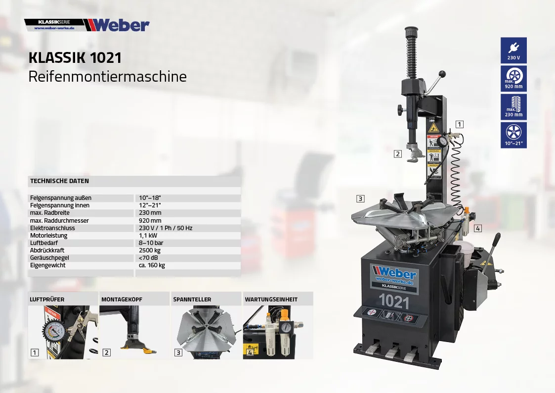 De Weber Klassik 1021 bandenmontage‑machine staat bekend om zijn betrouwbaarheid en is door het compacte ontwerp ideaal voor kleine werkplaatsen, taxibedrijven én privégebruikers. De zijwaarts scharnierende montagearm met excentrische spanning maakt een gemakkelijke en snelle afstelling van de montagekop mogelijk. Voor nog eenvoudiger monteren en demonteren is een optionele hulp‑montagearm aanbevolen, die helpt de bandenspouw op zijn plaats te houden.