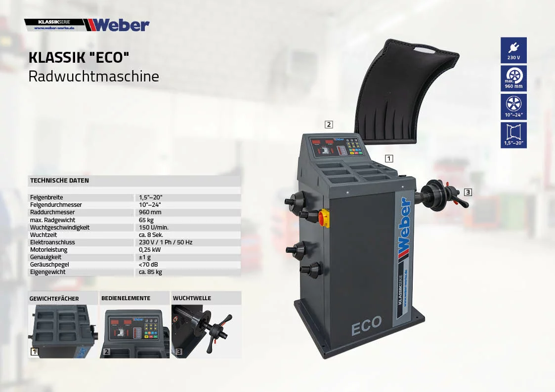 De Weber Klassik ECO wielbalancer combineert degelijke techniek met een klein vloeroppervlak en eenvoudige bediening. Daardoor is hij goed geschikt voor kleine werkplaatsen, wagenparkbeheerders en privégebruikers. De machine heeft een programma voor staalvelgen en vier extra programma’s voor aluminium velgen, tot een maximale wiel‑ diameter van 24”. Zowel statisch als dynamisch balanceren is mogelijk.